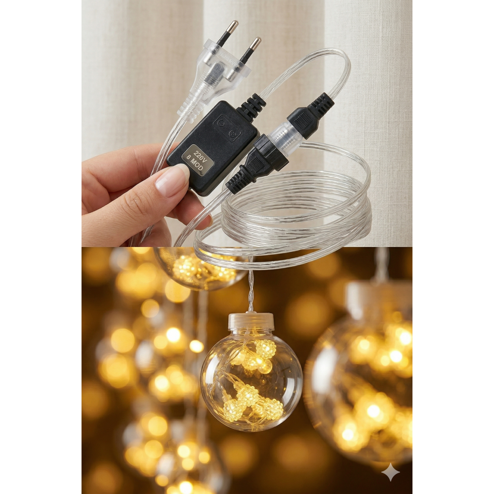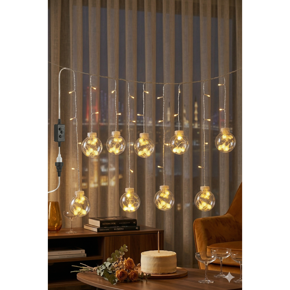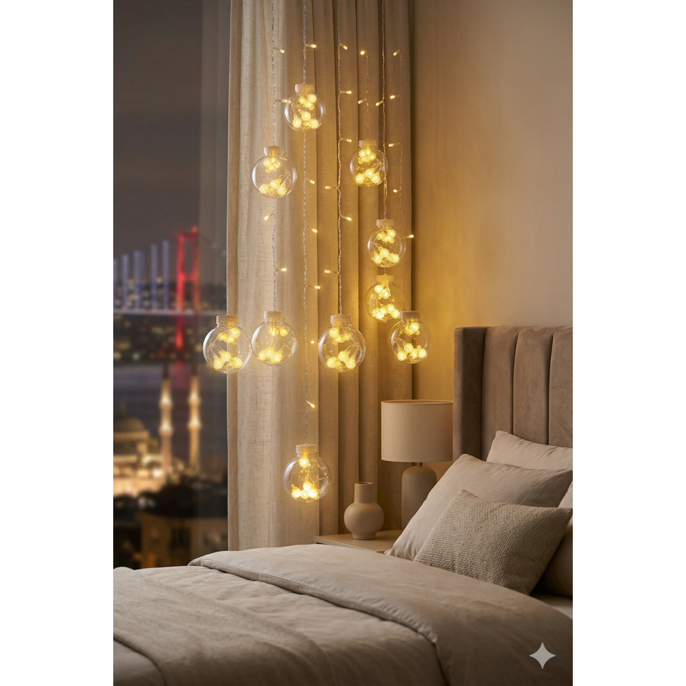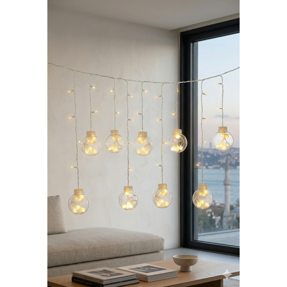 Premium Tasarım: 3 metre genişliğindeki şeffaf kablo üzerinde, içleri minik kristal LED’lerle dolu 10 adet dekoratif büyük top küre yer alır.