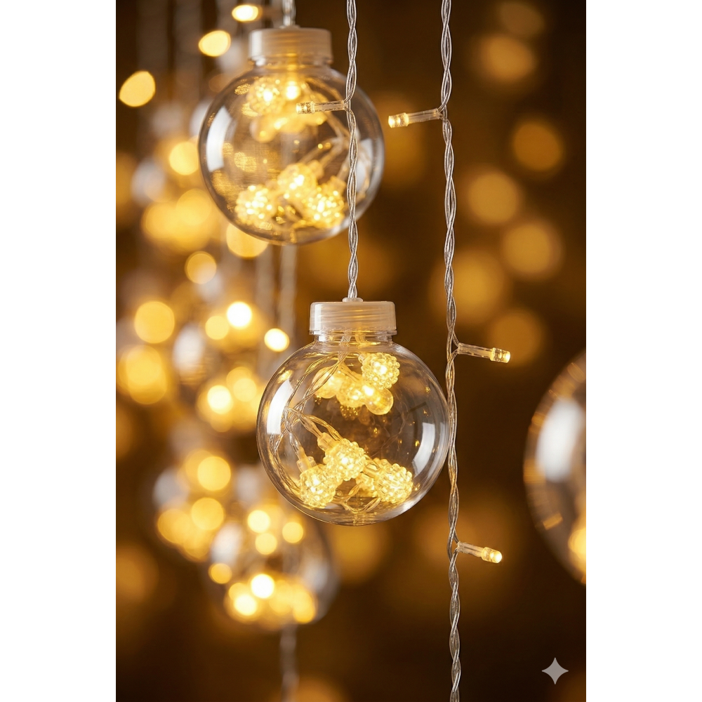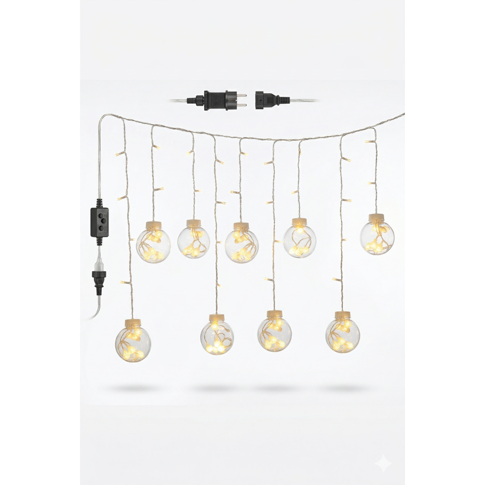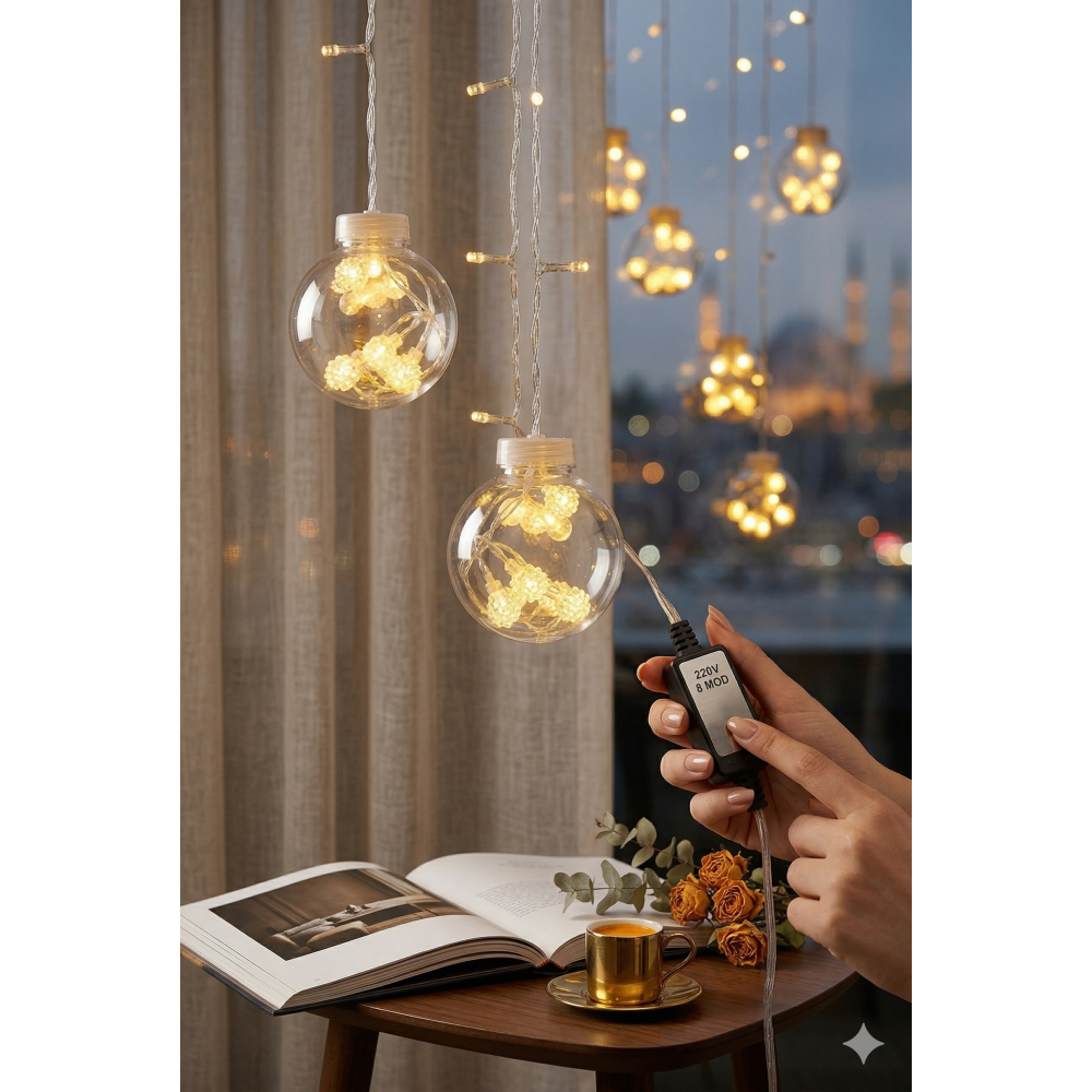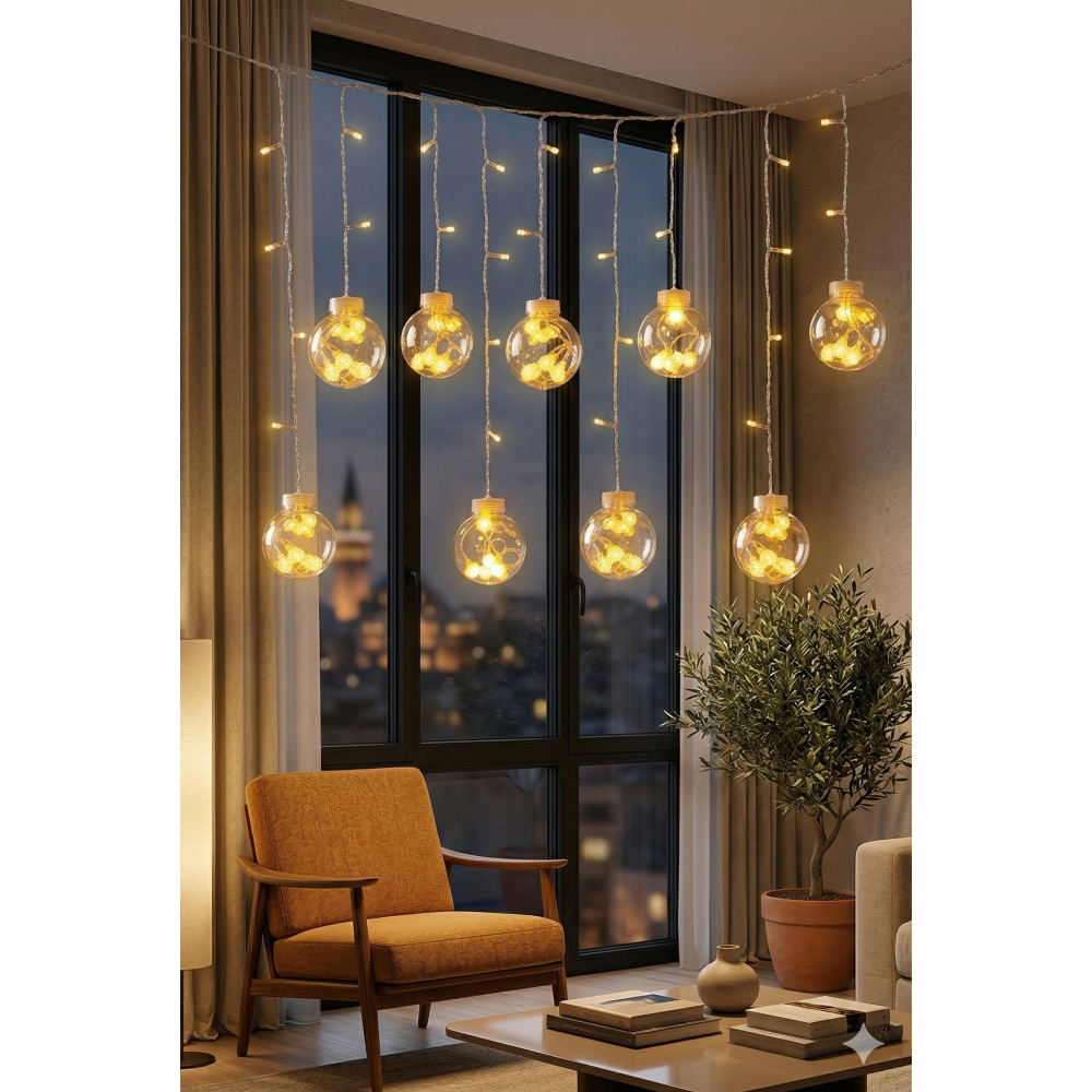Premium Tasarım: 3 metre genişliğindeki şeffaf kablo üzerinde, içleri minik kristal LED’lerle dolu 10 adet dekoratif büyük top küre yer alır.