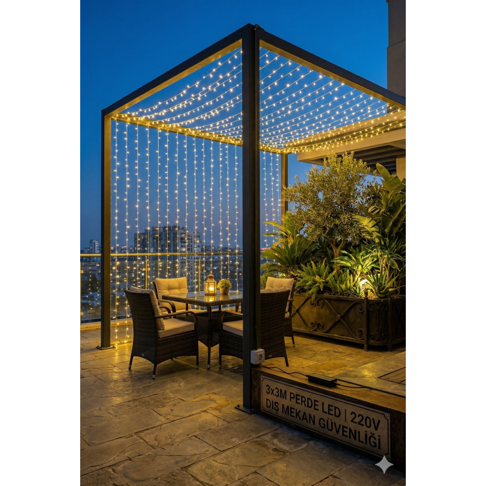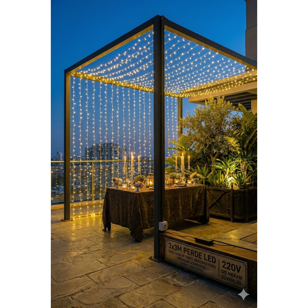 3x3m Premium Perde LED - 8 Fonksiyonlu, Su Geçirmez İç Dış Mekan Teras Dekor Işıkları