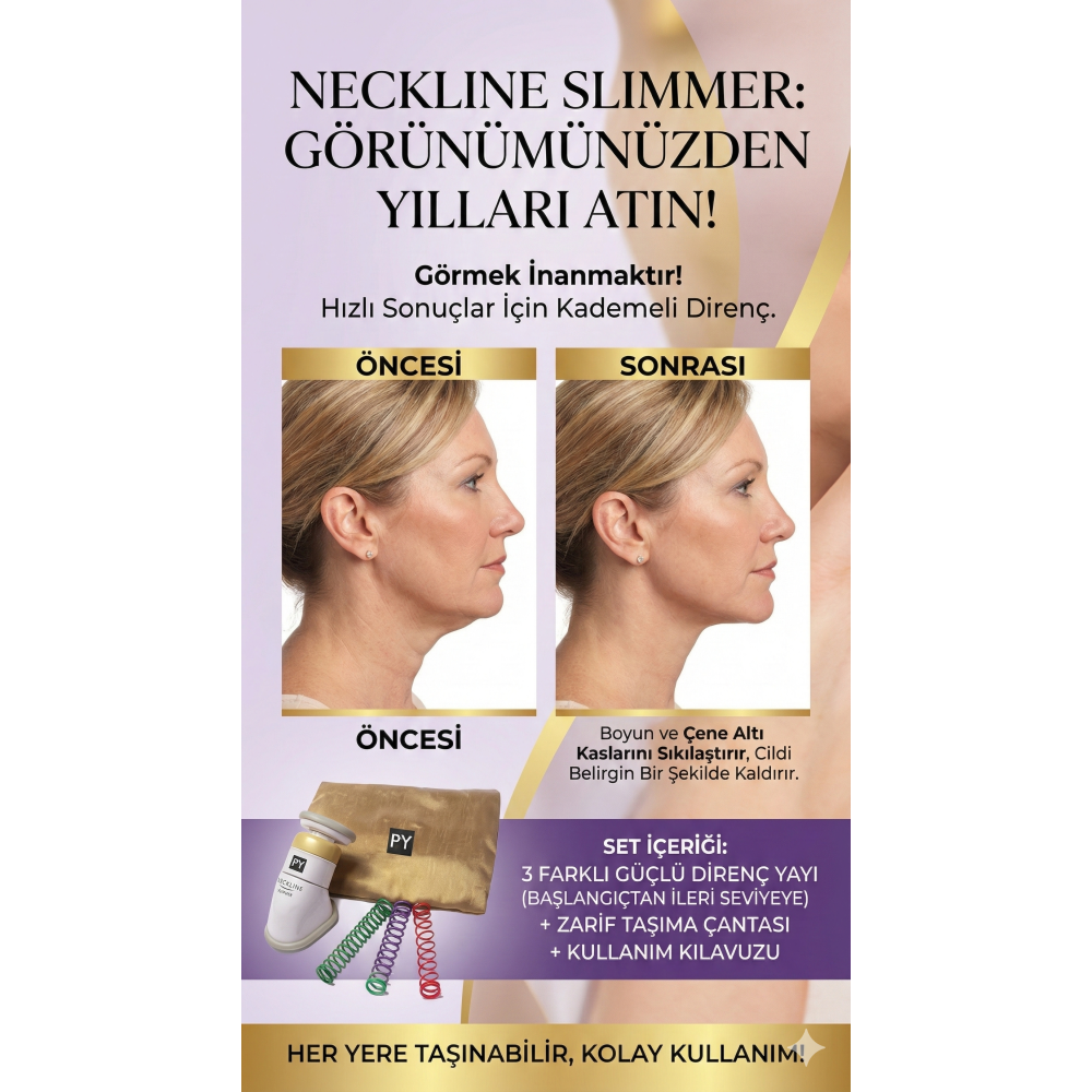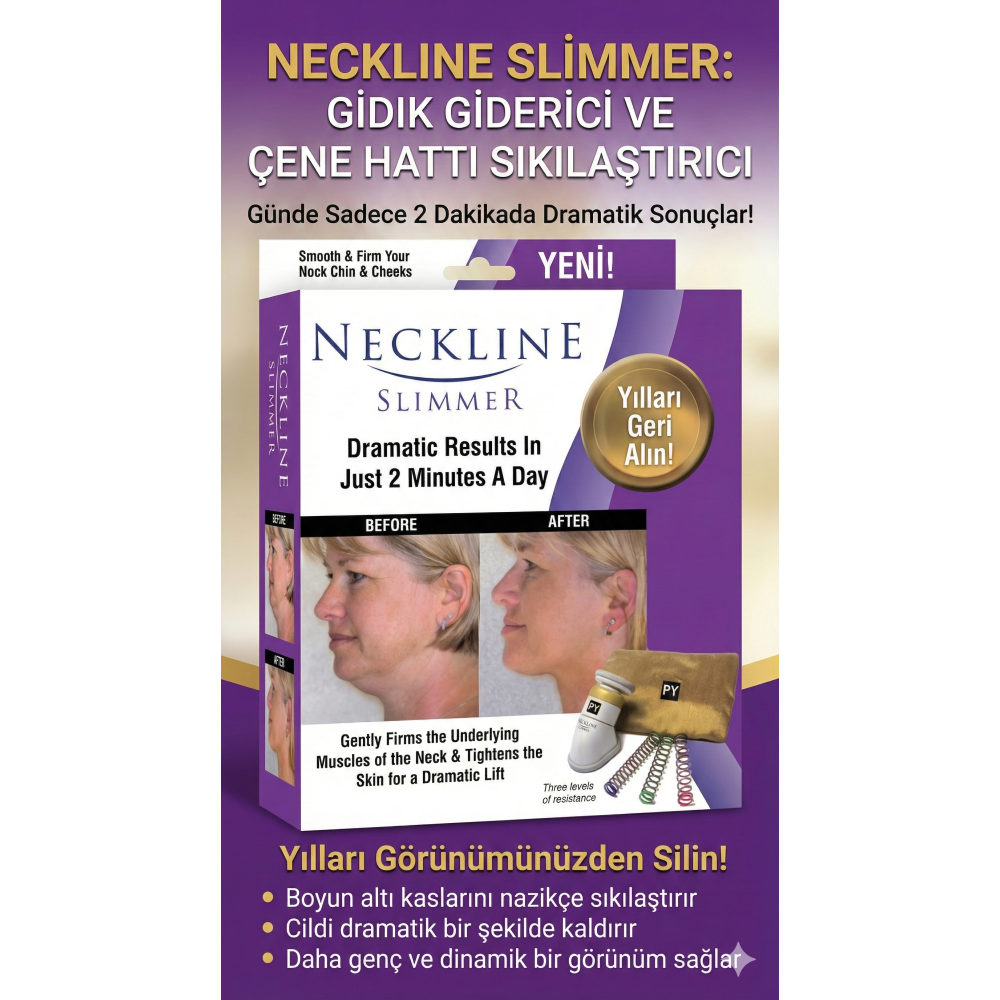 Tamamen acısız ve ağrısız olarak zayıf çene altı kaslarının güçlendirilmesi ve yüz altı ile boyun gerginliğinin yeniden kazanımı için geliştirilmiş bir aparattır. Neckline Slimmer ile günlük 2 dakikalık masaj ve egzersiz sonunda çene altı, boyun kısmı ilk günkü tazeliğine ve sıkılığına kavuşacak. Paket içerisinden çıkmakta olan 3 farklı dirençte yay sistemi ile Neckline Slimmer güç ayarı değiştirleceği gibi uygulamanın ilerleyen günlerinde isteğe göre sertlik derecesi yükseltilebilmekte veya düşürülebilmektedir.İnsanların egzersiz hareketlerini kolaylıkla ve sıkılmadan yapabilmeleri için yepyeni bir egzersiz sistemi düzenlenerek Neckline Slimmer′ı geliştirmiştir. Neckline Slimmer, yüz, çene ve boyun kaslarında kalıtsal yahut zaman içerisinde oluşmuş fazla yağ birikimlerini çalıştırarak daha sıkı ve diri bir görünüm elde etmeyi sağlar. Boyun kasları da vücuttaki her kas gibi egzersize ihtiyaç duyar ve eğer düzenli egzersiz yapılırsa diğer kaslarımız gibi sonuç verir. Ürün Özellikleri: Neckline Slimmer ile yapılan egzersizlerde; Egzersizlerinizi eğlenceye dönüştürür, Zaman kaybı yok, Egzersiz programını uygulama zorluğu yok, Sağlığınıza yan etkisi yok, Yaş sınırı yok, Acı çekmek yok, Kullanımda zorluk çekmek yok, Morarma, şişme veya kızarıklık yok,