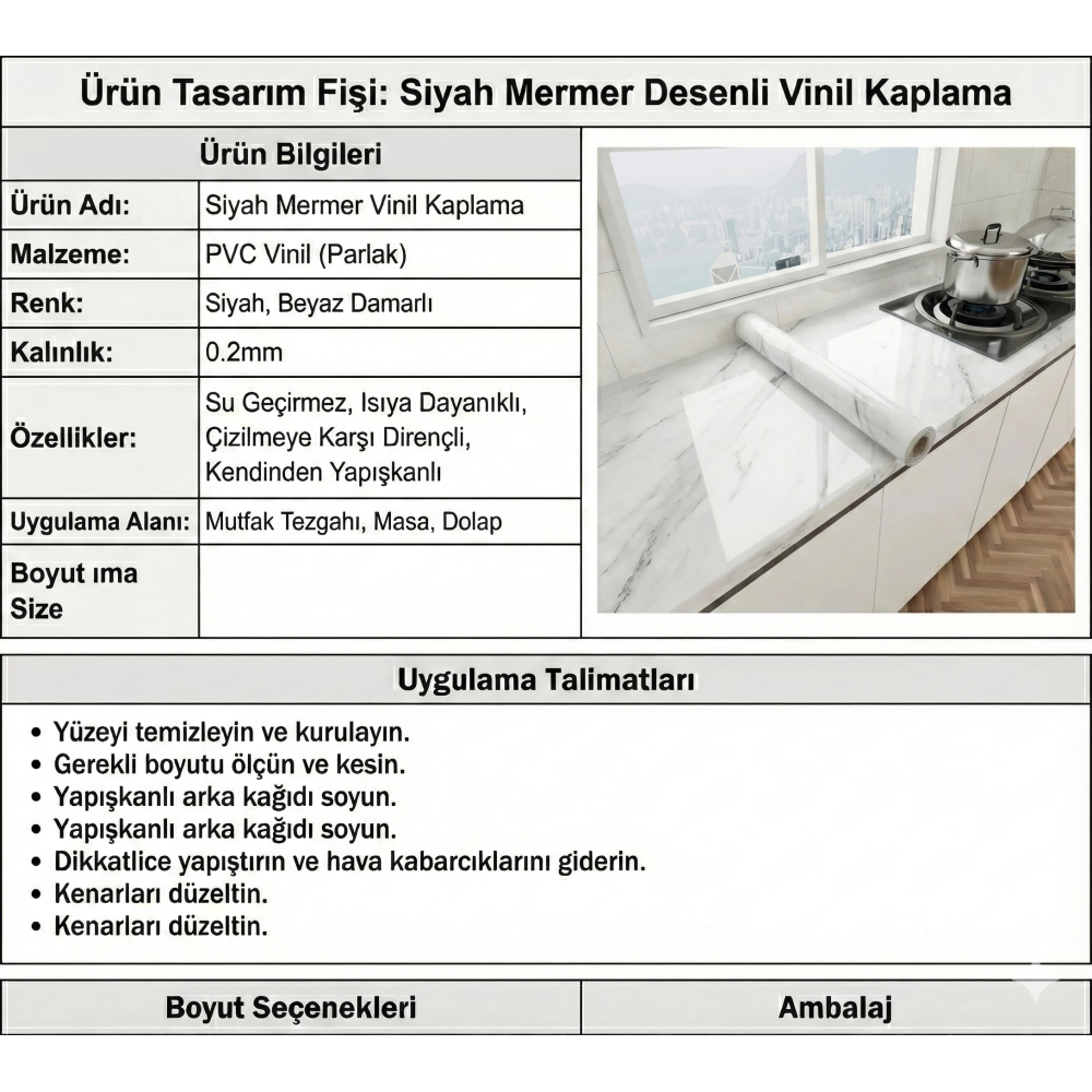 Mutfak tezgah üstü, çekmece, dolap, boyalı duvar, pürüzsüz duvar kağıdı, pürüzsüz ahşap yüzey, metal yüzey, cam yüzey, plastik yüzey için kullanılabilir.