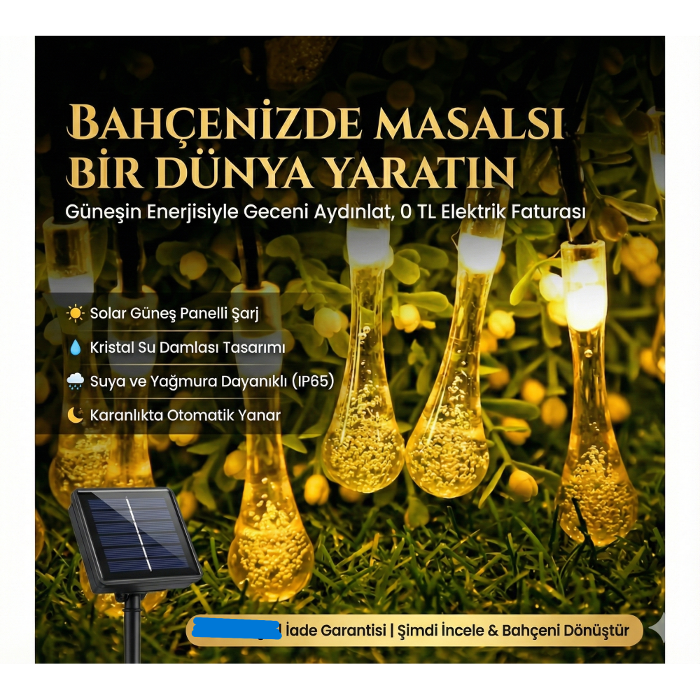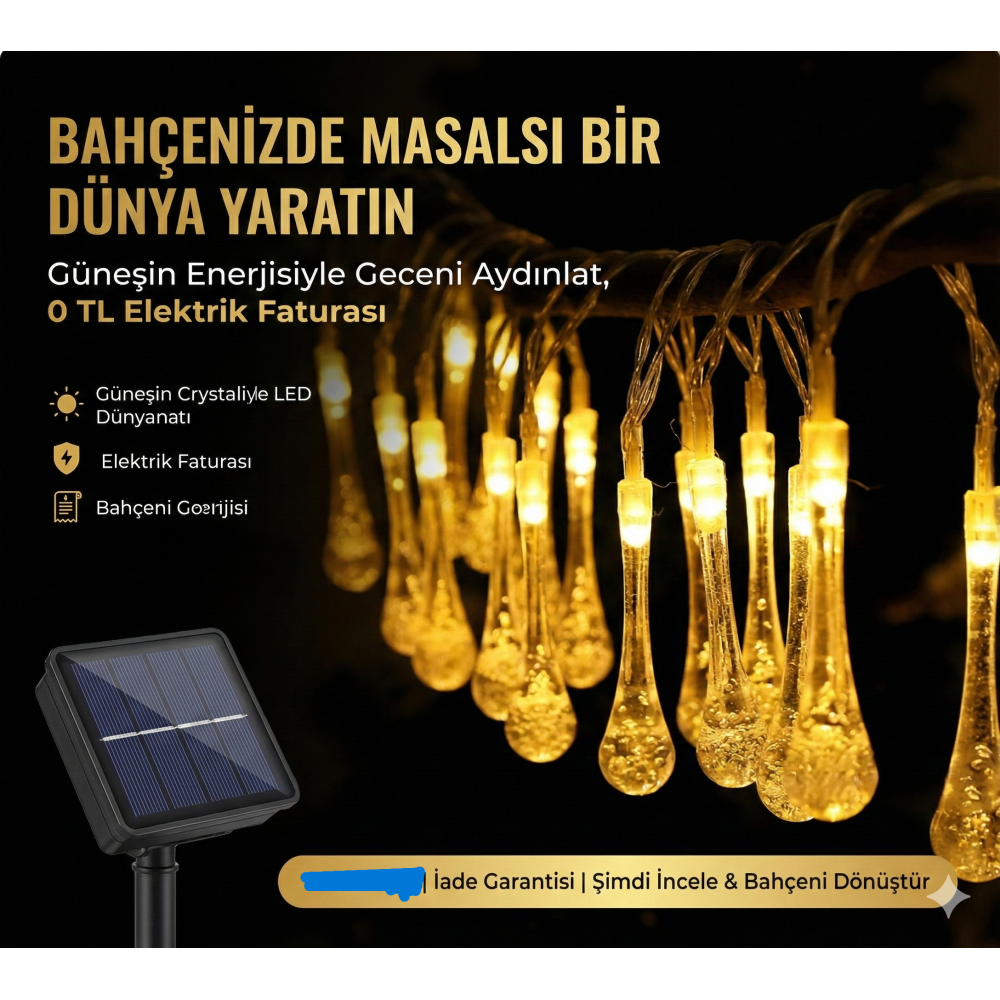 10 Led 2 Metre Sarı Kristal Su Damlası Güneş Enerjili Led Işık Solar Bahçe Ağaç Lamba Aydınlatması