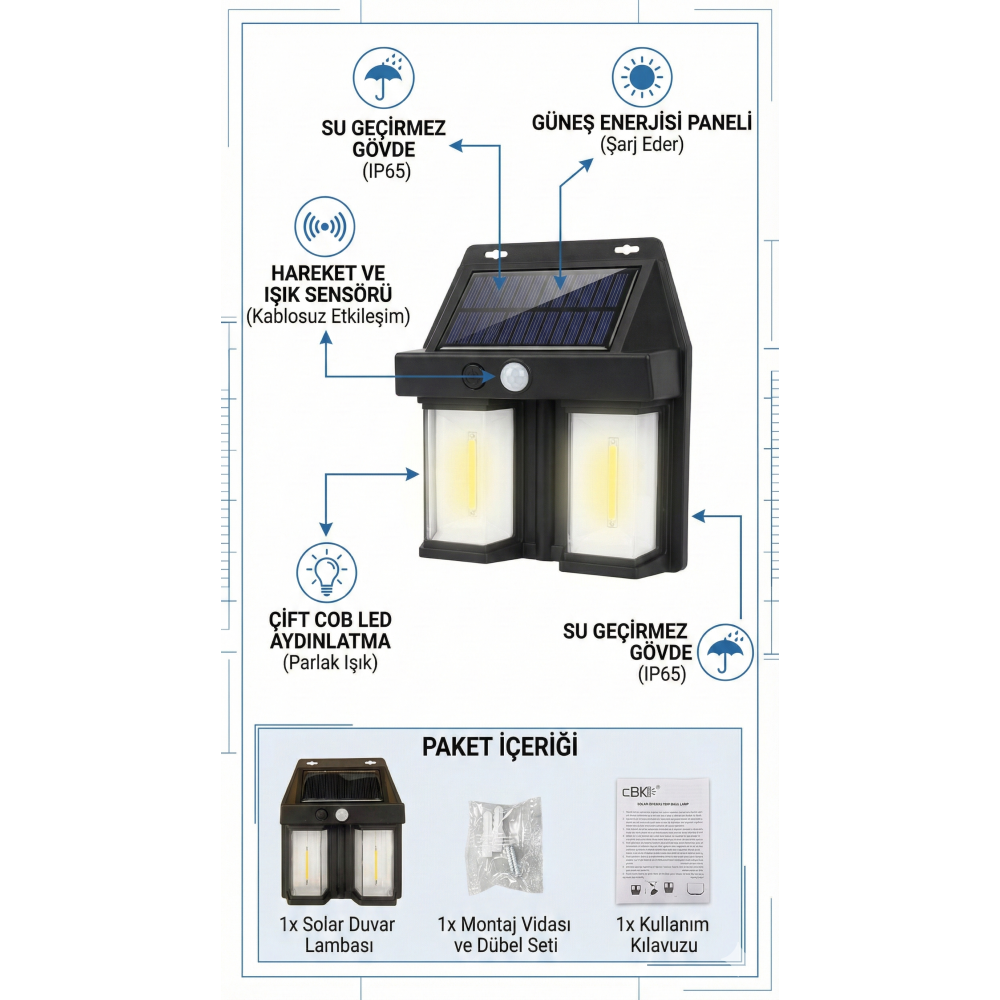 - Çift LED Işık: İki adet enerji tasarruflu LED ışıkla donatılan bu lamba, iç veya dış mekanlarınız için yeterli aydınlatma sağlar.
